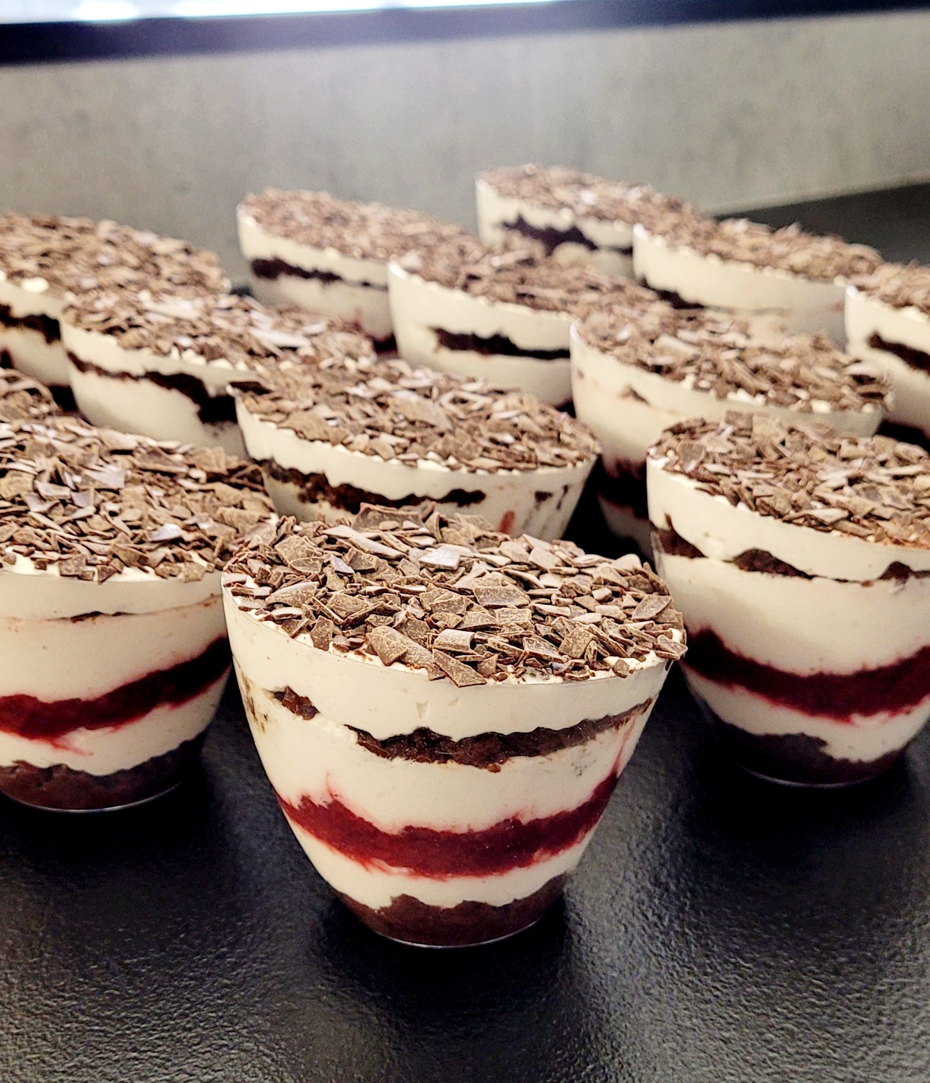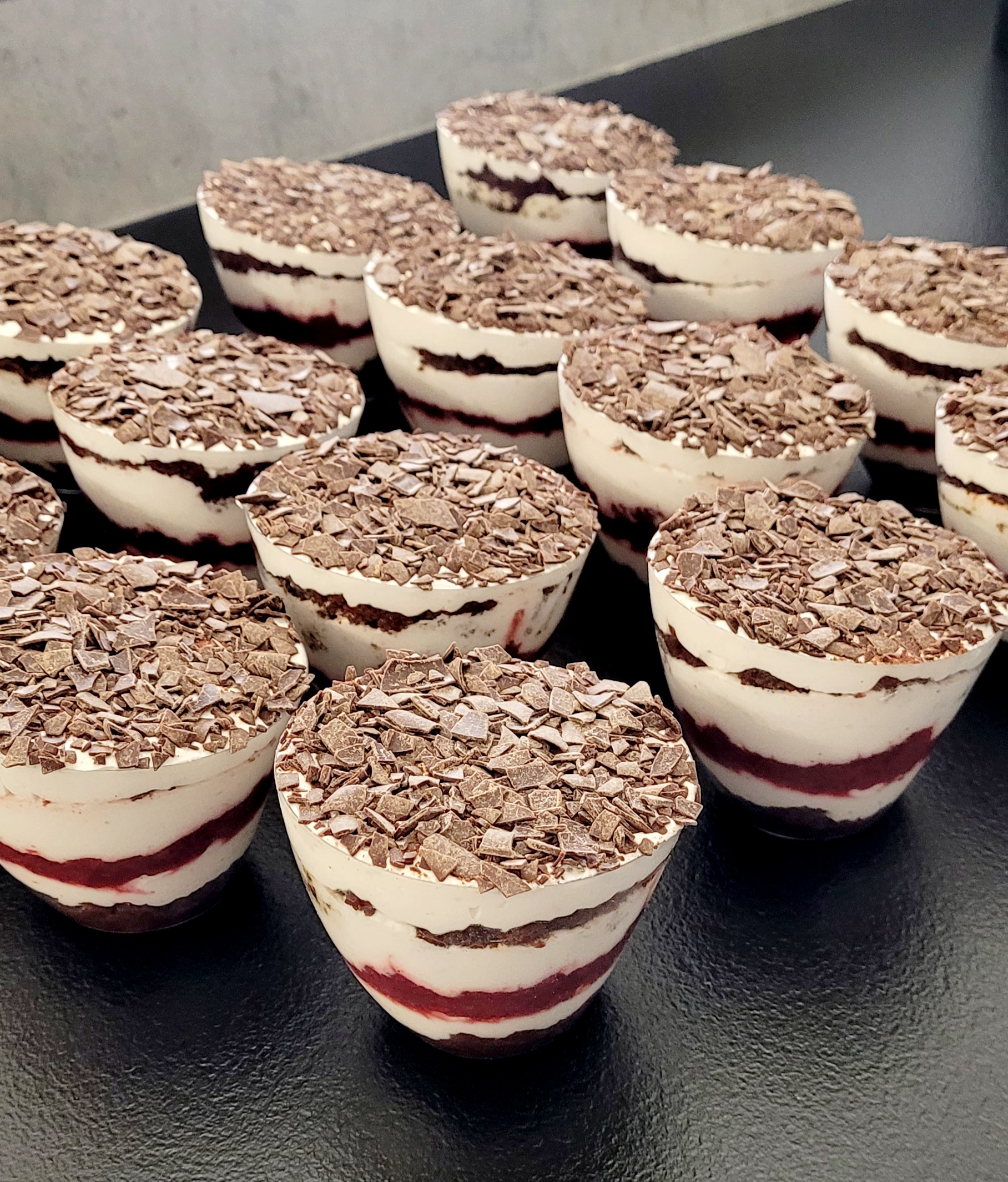 – blaturi de cacao însiropate cu sirop de vișine, cremă de griș cu lapte de cocos și vișine