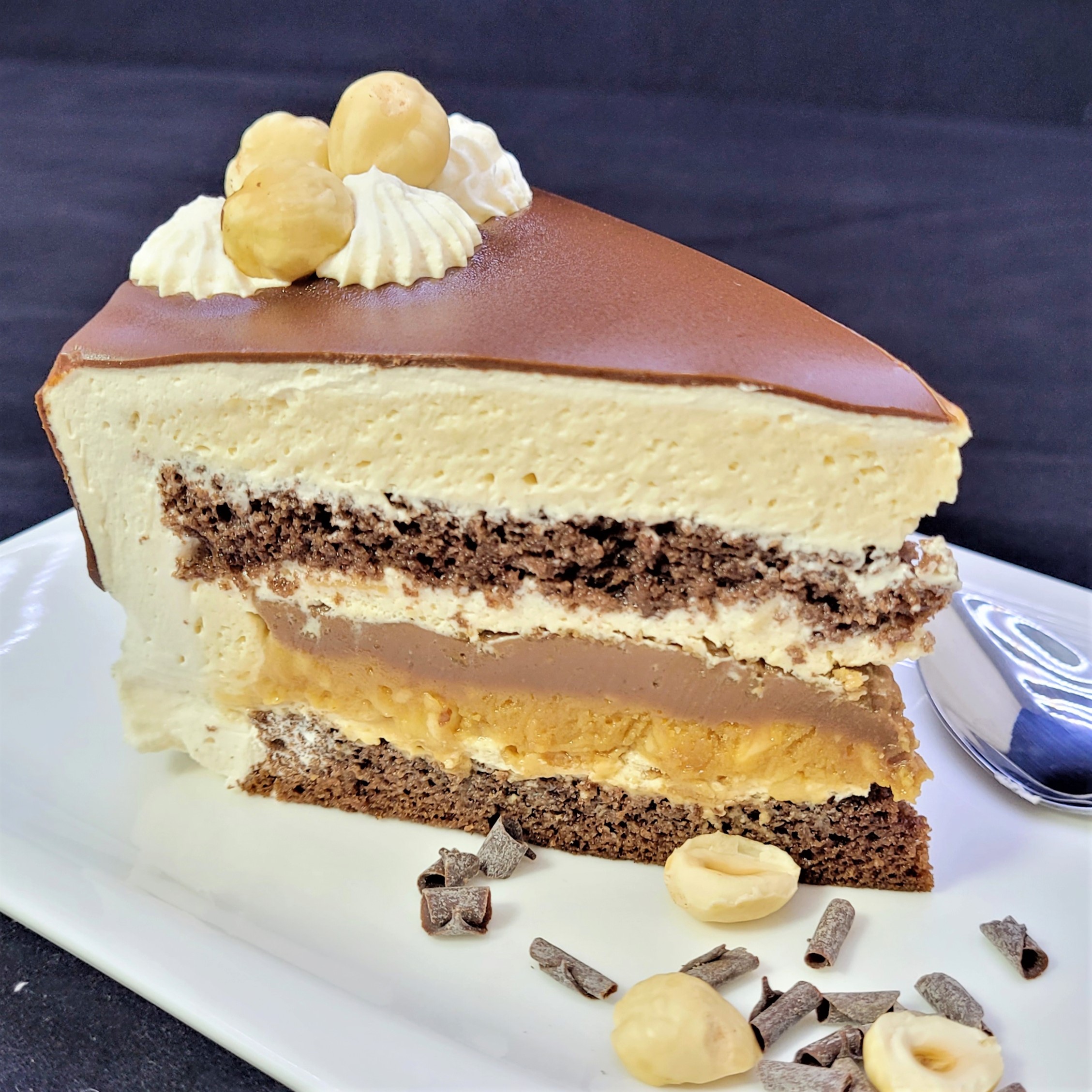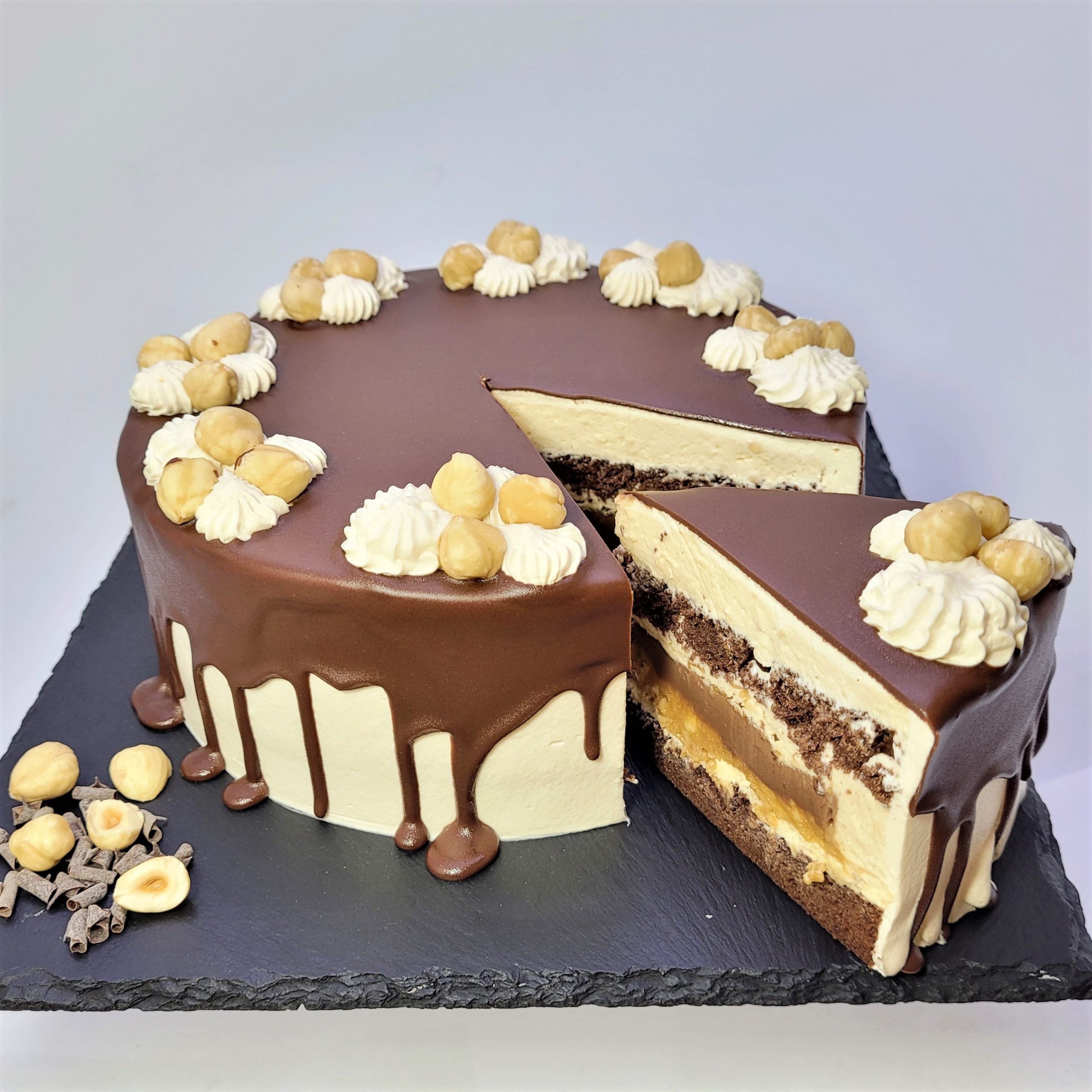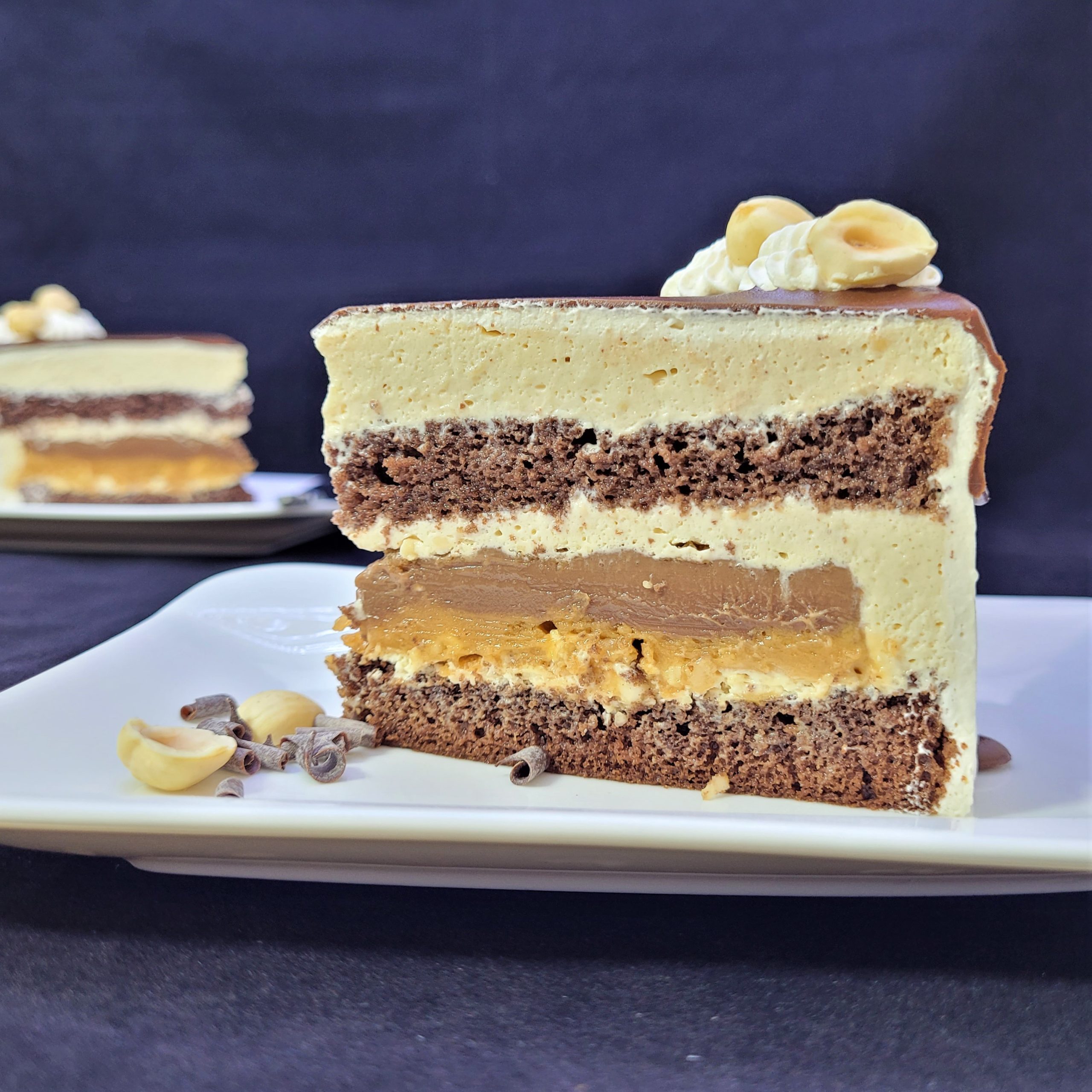Blaturi pufoase de ciocolată, mousse de caramel și inserție din pastă de arahide, sos caramel, alune de pădure și ganache de ciocolată.